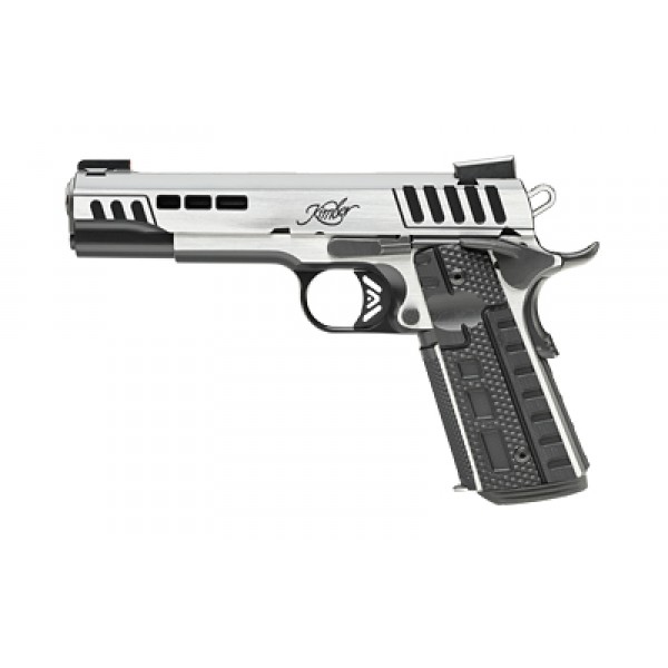 The RAPIDE(SCORPIUS) (DN,NS). A truly unique 1911 with stepped cocking serrations, slide lightening cuts for faster Slide lock-up and DLC coated barrel for extreme durability. Equipped with Kimber Stiplex TM front strap stippling and Black G10 Rapide patterned grips for extra griping confidence. Kimpro Black finish with brush polished flats finish off the striking looks.
