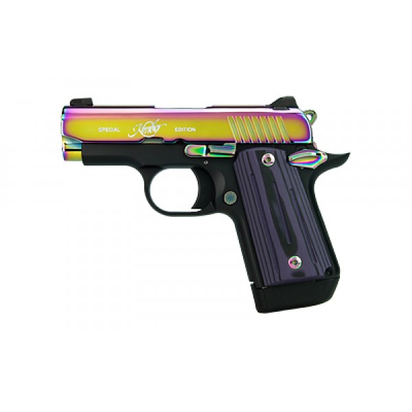 The Micro 9 Aurora features a Aurora multi color PVD slide, Aurora multi color PVD small parts, Kimpro Black Frame, and standard night sights.